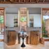 “Rumah Menara” in Sumbanese language depicts the main house or the center point of a local village usually recognised by the tallest traditional Sumba style roof. You enter the Menara Villa through a Foyer, greeted by a painting of a traditional Sumba Village and stylised maps of Sumba. The Foyer branches off to the master bedroom to the left and TV Lounge (convertible to a guest bedroom for children) to the right. Menara Villa is kept in light and calming cream and white soft colours throughout with light natural terrazzo floors that continue throughout the expansive villa and its ensuite bathrooms.
