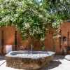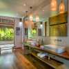 The sliding doors towards the bathroom open to reveal a large air-condition vanity with 2 large natural stone sinks and mirrors and glass windows expanding even further with views towards a private garden with outdoor bathtub and shower. There is a semi indoor toilet and shower as well.